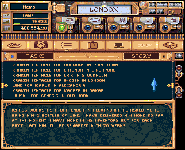 In AQUABYSS you may continue the protagonist's adventures from the graphic novel or choose your own path and navigate the open, vast underwater depths. Naturally, in both modes, you may trade, explore and discover new cities, upgrade your submarine, acquire new ones, develop your character, have dialogues with NPCs, complete quests, mine resources from the ocean floor, face or avoid the dangers lurking in the depths, compare your achievements with other players, or finally meet them online in the chat. This is just a foretaste of what awaits you in the underwater world of AQUABYSS!